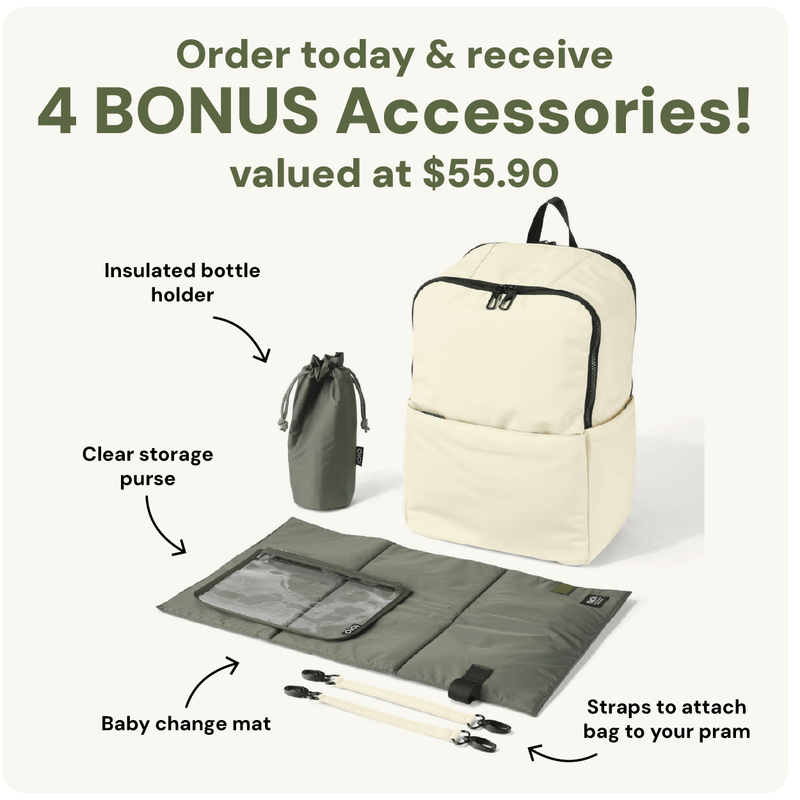 Yes! The Multitasker Nappy Backpack comes with a changing mat, insulated bottle holder, stroller straps and clear purse valued at $55.90.